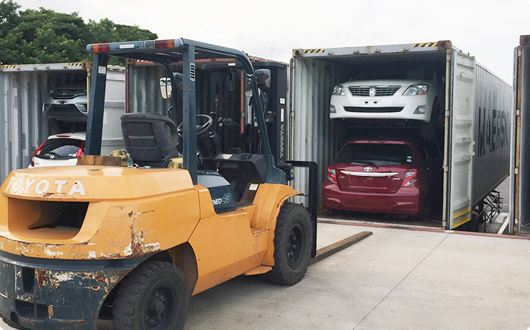 中古車の仕入れから、陸送手配、バン詰め作業、通関手続き、ブッキングまで、一括してお引き受けいたします。